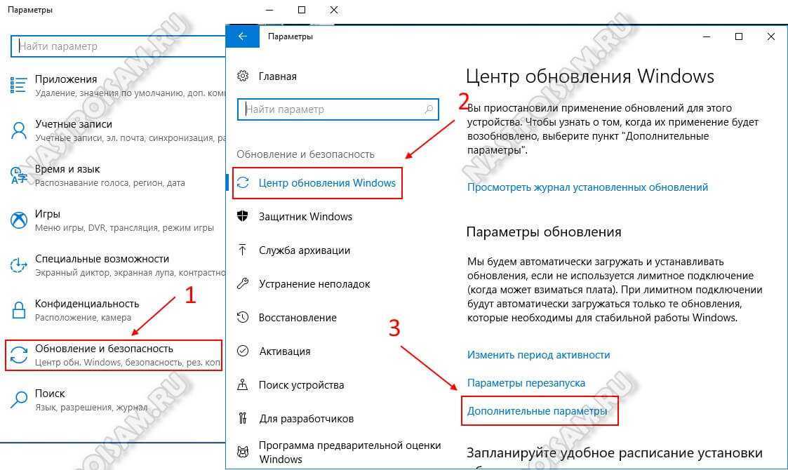 - Зайдите в Параметры — Обновление и безопасность и нажмите «Дополнительные параметры» в разделе «Центр обновления Windows».