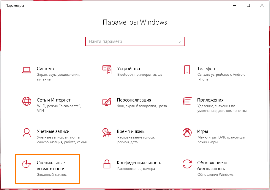В открывшемся списке разделов, переходим в «Специальные возможности».