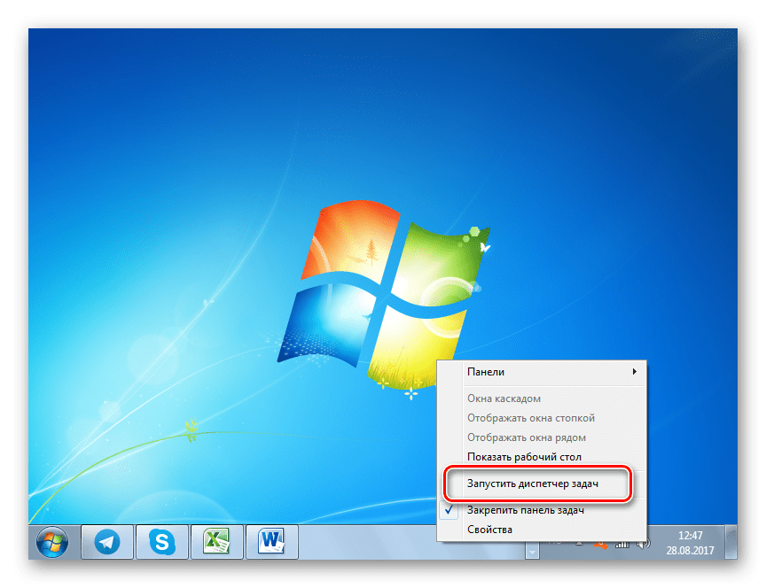 - Наиболее быстрый метод запустить «Диспетчер задач» в Виндовс 7 — это набрать Ctrl+Shift+Esc. Как раз данный вариант и подходит в случае отказа работы «Проводника». Если же у вас со встроенным файловым менеджером все в порядке и вы привыкли выполнять действия не с использованием «горячих» клавиш, а более традиционными методами, то в этом случае щелкните правой клавишей мыши (ПКМ) по «Панели задач» и остановите выбор на варианте «Запустить диспетчер задач».