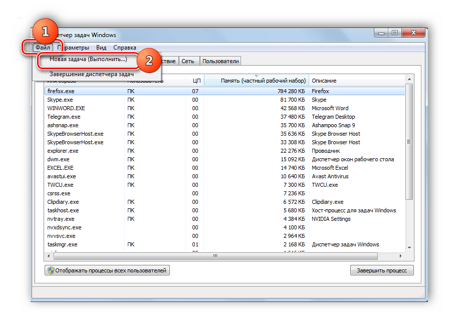 Независимо от того, в каком разделе запустится «Диспетчер задач», кликните по пункту «Файл». Далее выбирайте вариант «Новая задача (Выполнить…)».