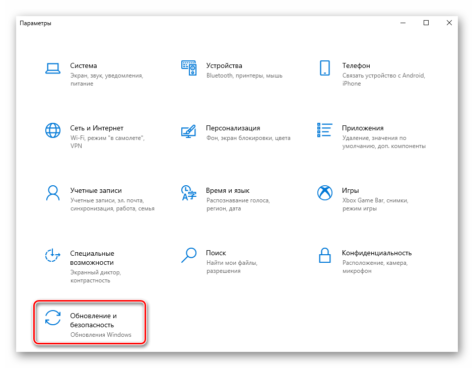 - Нажмите сочетание клавиш «Windows+I», а потом кликните левой кнопкой мышки в открывшемся окне по разделу «Обновление и безопасность».