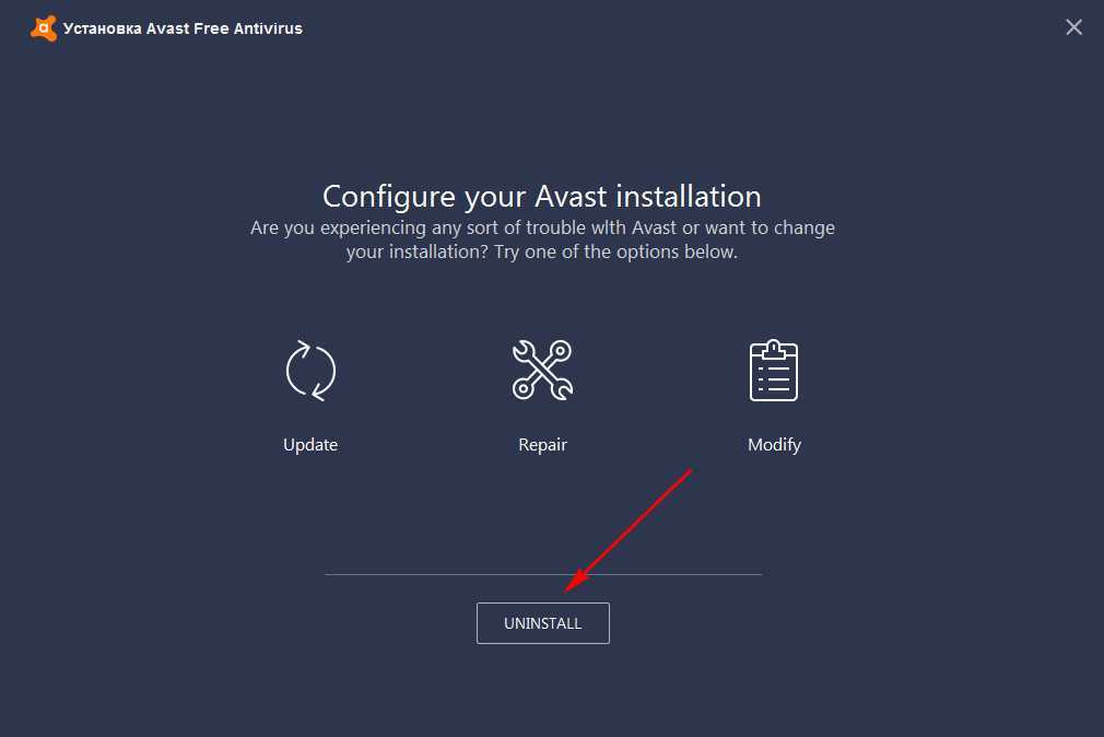 Если в системе никаких ошибок нет и установка была произведена корректно, то запустится утилита удаления Avast Free Антивирус… тут можно переустановить антивирусное нажав кнопку «Восстановить», изменить состав компонентов (это то окно, с настройками перед установкой) и соответственно искомая кнопка «Удалить» — она то нам и нужна.