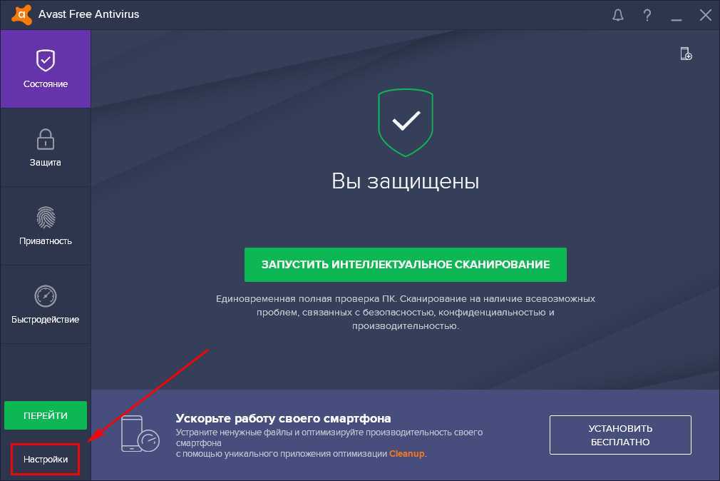 Прежде чем очистить компьютер от «Avast”, нам нужно отключить его самозащиту, иначе антивирус не даст удалить себя. Отключить «Avast” можно через его настройки, внимательно изучите пошаговую инструкцию на скриншотах ниже: