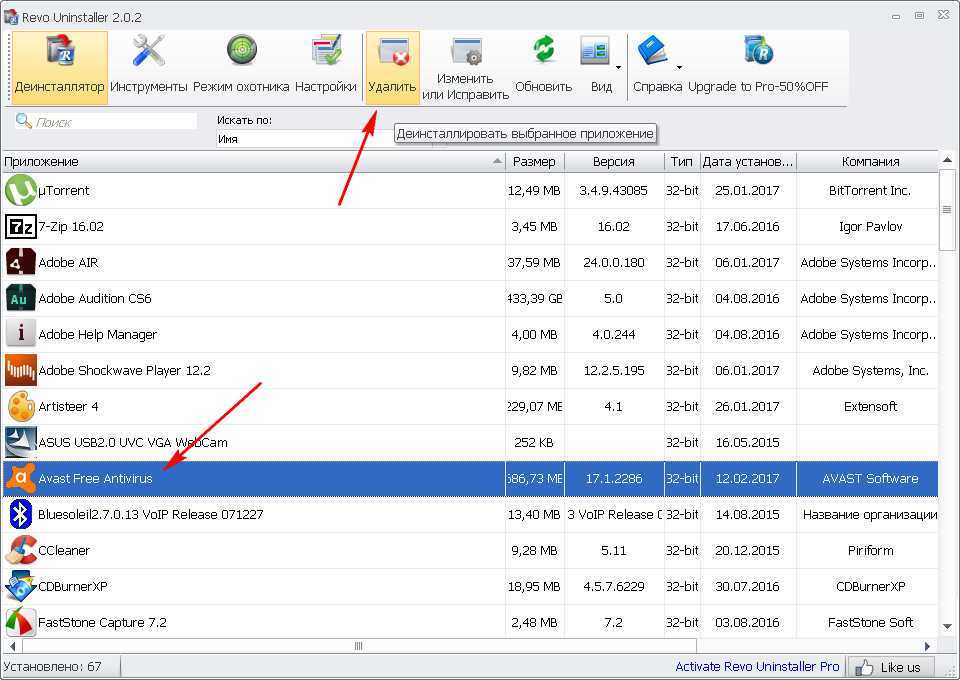 Запустите программу, в открывшемся окне найдите в списке антивирус «Avast», выделите его мышкой и нажмите наверху на «Удалить».