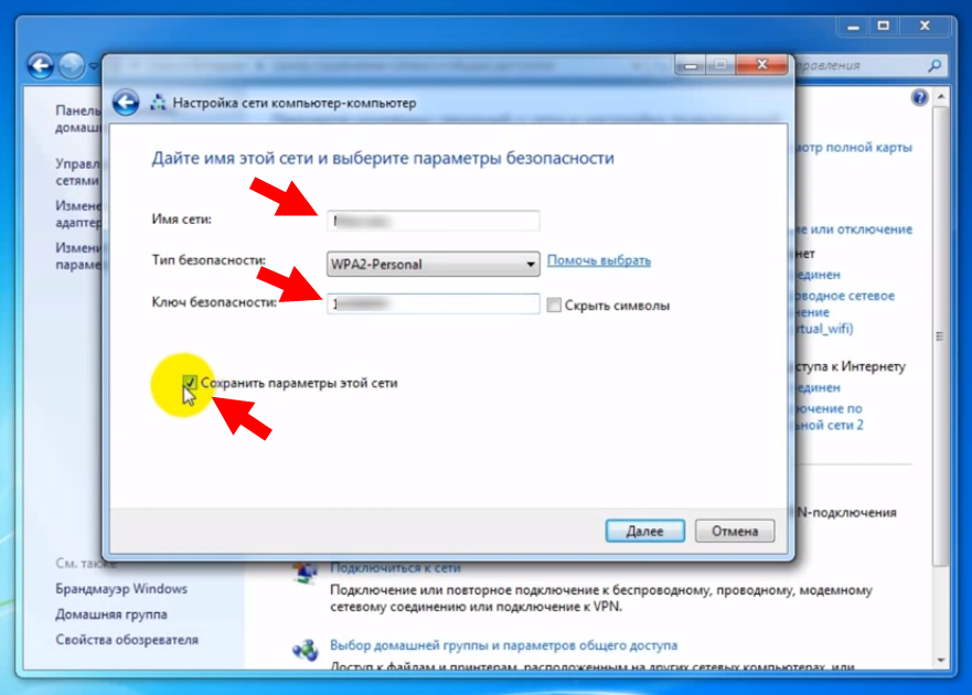 Далее вводим параметры будущей вай фай сети. Имя сети — вписываете любое название. Тип безопасности – можно поставить «WPA2 — Personal». Ключ безопасности — вбиваем пароль и запоминаем его, он понадобиться во время подключения к вашему ноутбуку. Не забываем в самом низу отметить галочкой «Сохранить все параметры». Жмем «Далее». Появиться еще одно окно, где требуется клацнуть на пункте «Включить общий доступ к ….».
