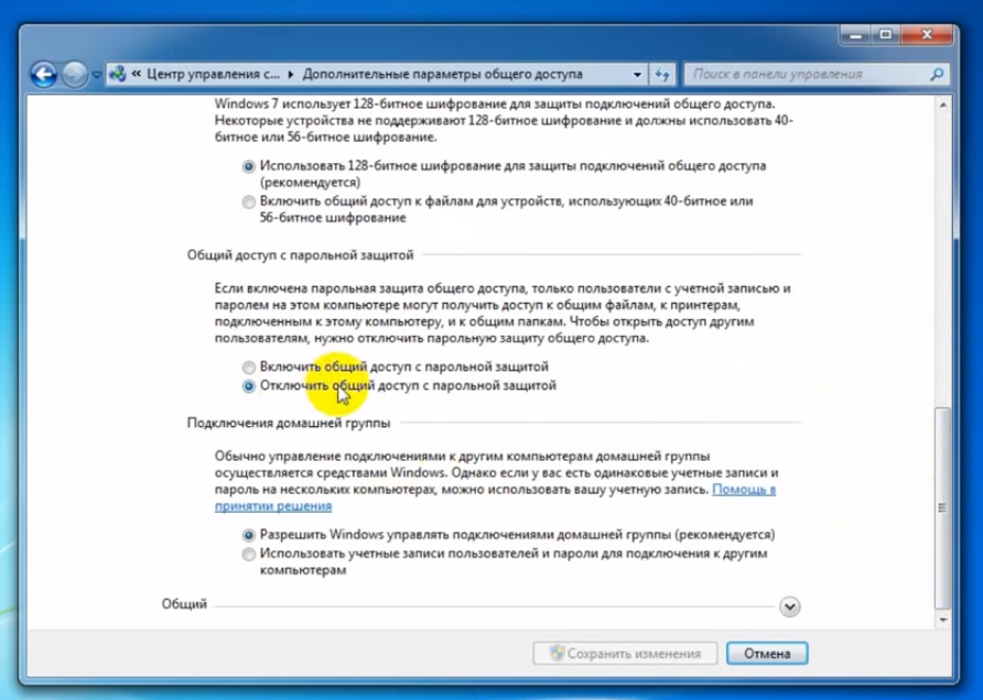 В новом окне отметьте все разрешения, кроме «Общего доступа с парольной защитой». В нём отметьте «Отключить».