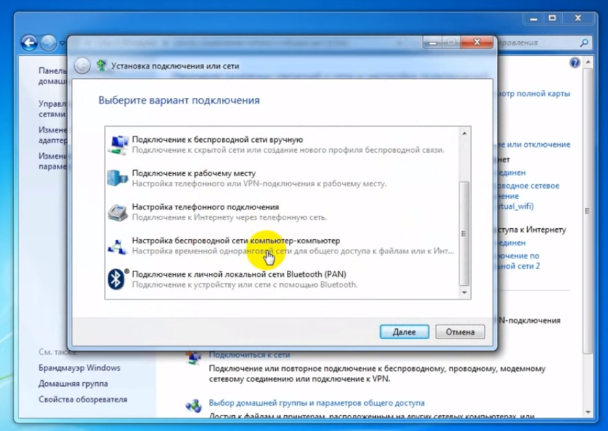 Появится окно со списком. Отметьте «компьютер-компьютер».