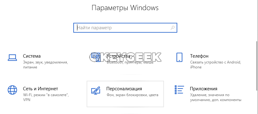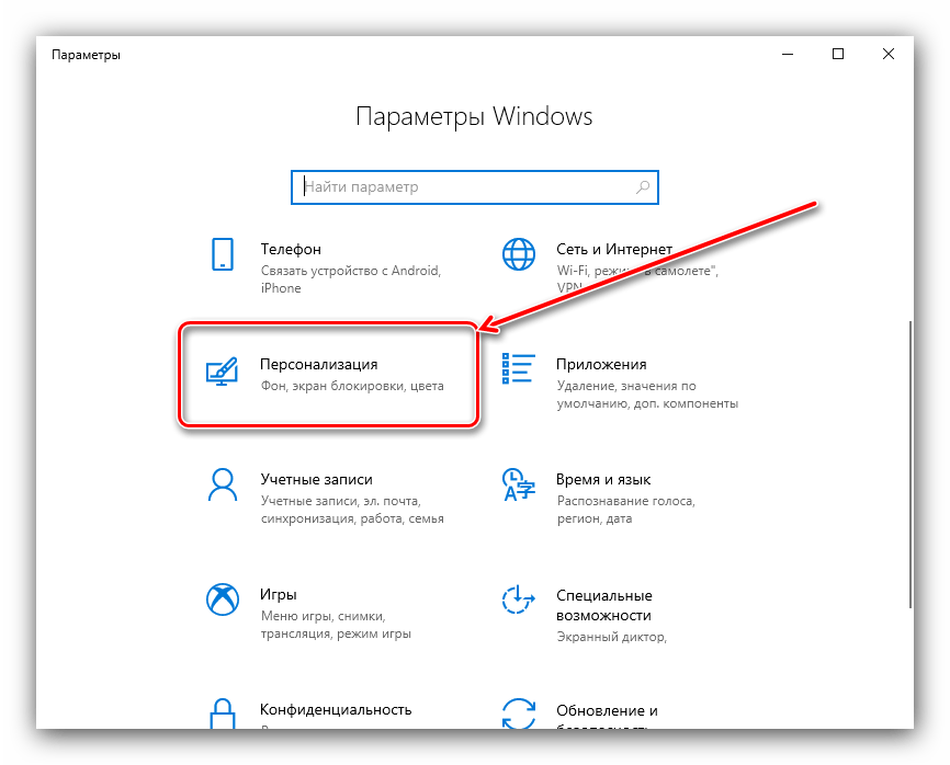 - Нажмите комбинацию клавиш Win+I – появится окно «Параметры», в котором выберите раздел «Персонализация».