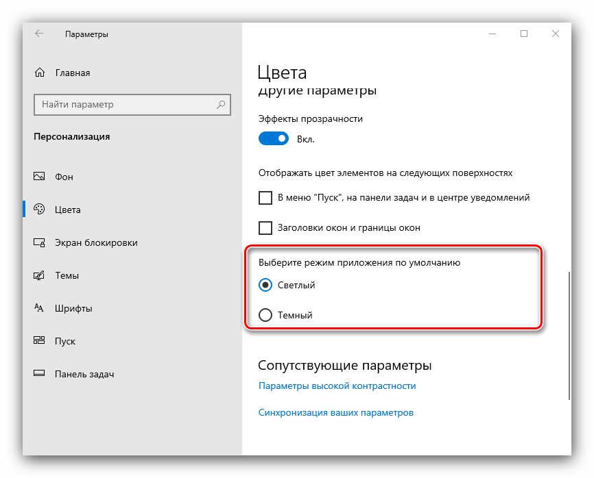 Перейдите в левой части окна в подраздел «Цвета». Здесь нужно установить «Выберите режим приложения по умолчанию» в вариант «Темный».
