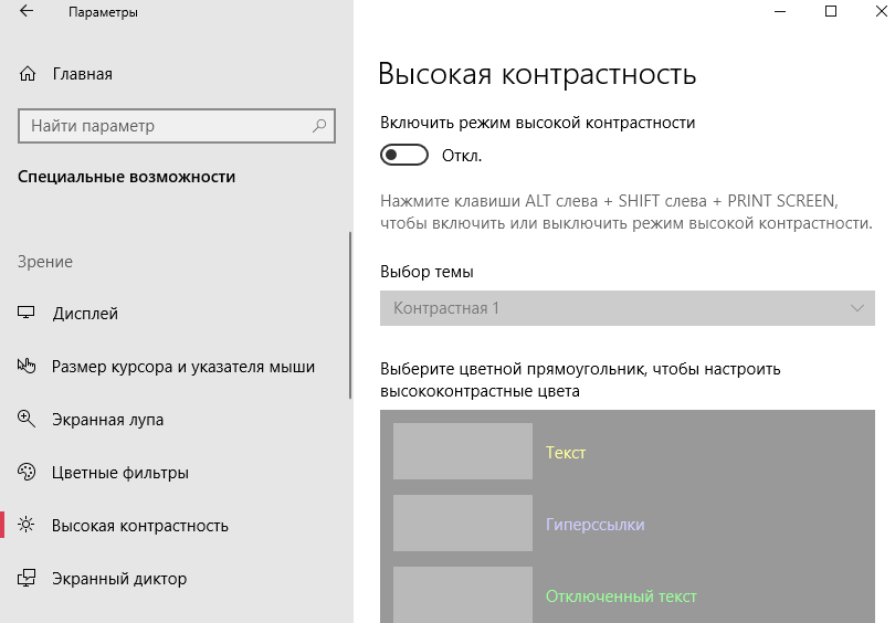 Включить или выключить режим высокой контрастности можно используя комбинацию клавиш Alt +Shift + PrintScreen. Или же как альтернатива можно перейти Пуск > Параметры > Специальные возможности > Высокая контрастность и перетянуть ползунок включения режима высокой контрастности в положение Включено.