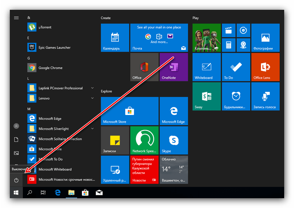 - Первое, что стоит делать при столкновении с подобным – отключить быстрый запуск компьютера. Для этого откройте меню «Пуск» и кликните по кнопке выключения.