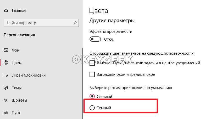 с левой стороны выбираем “Цвет”, а с правой стороны внизу возле “Выберите режим приложения” поставьте галочку в поле “Темный”