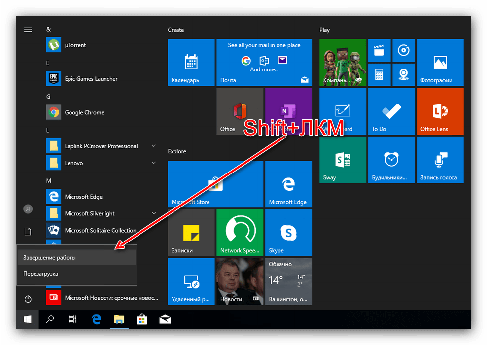 Далее зажмите Shift и воспользуйтесь пунктом «Завершение работы».
