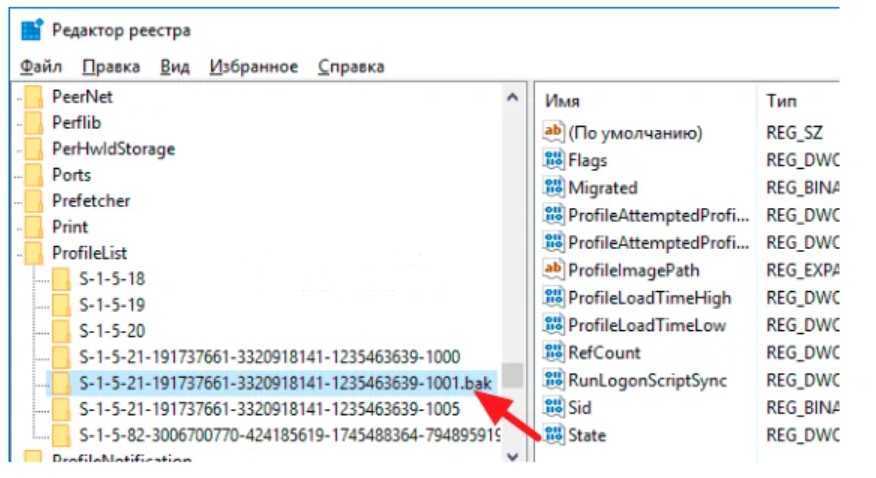 Здесь находите папку с длинным названием относительно других. Также возможно наличие такой же папки с расширением .bak. Если кликнуть на ту, которая без .bak, то в переменной ProfileImagePath должен быть указан профиль temp или что — то со словом temp.
