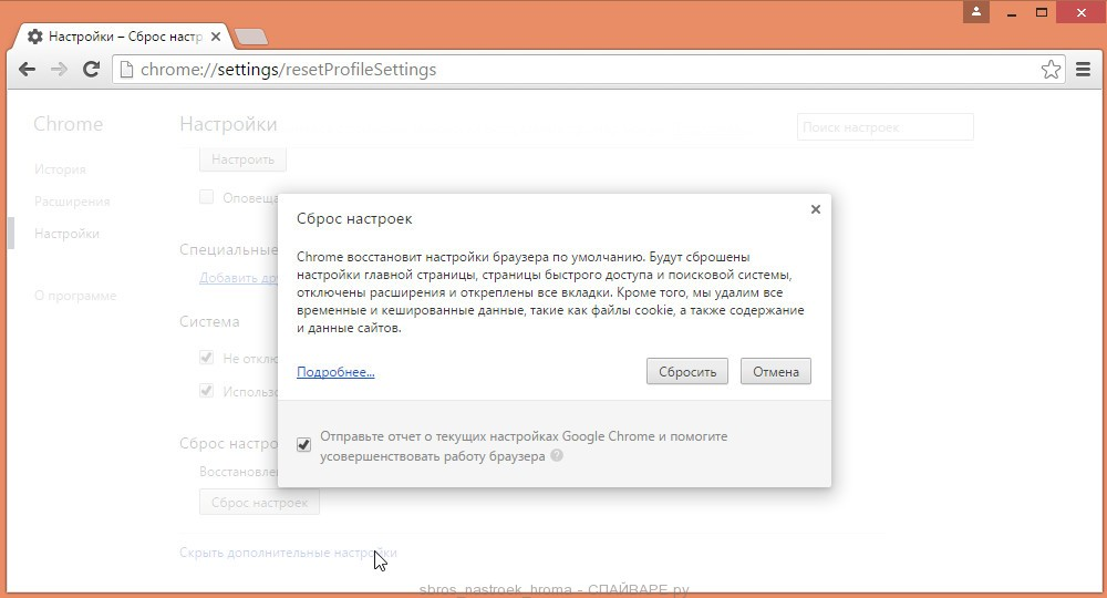 сброс настроек (на примере Chrome). Это также позволит удалить зловред, установив первоначальные параметры. Отметим, что все пароли, закладки, персональные данные в браузере сохранятся, можете не переживать.