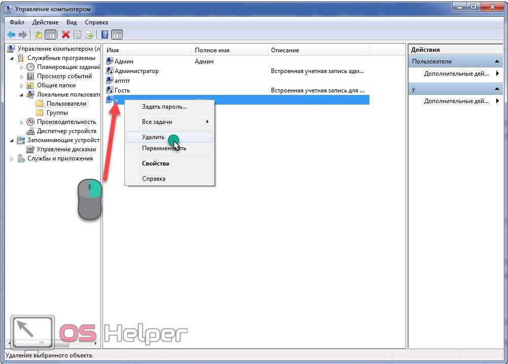 - Вызвать контекстное меню от учетки, которую планируется убрать и нажать «Удалить»;
