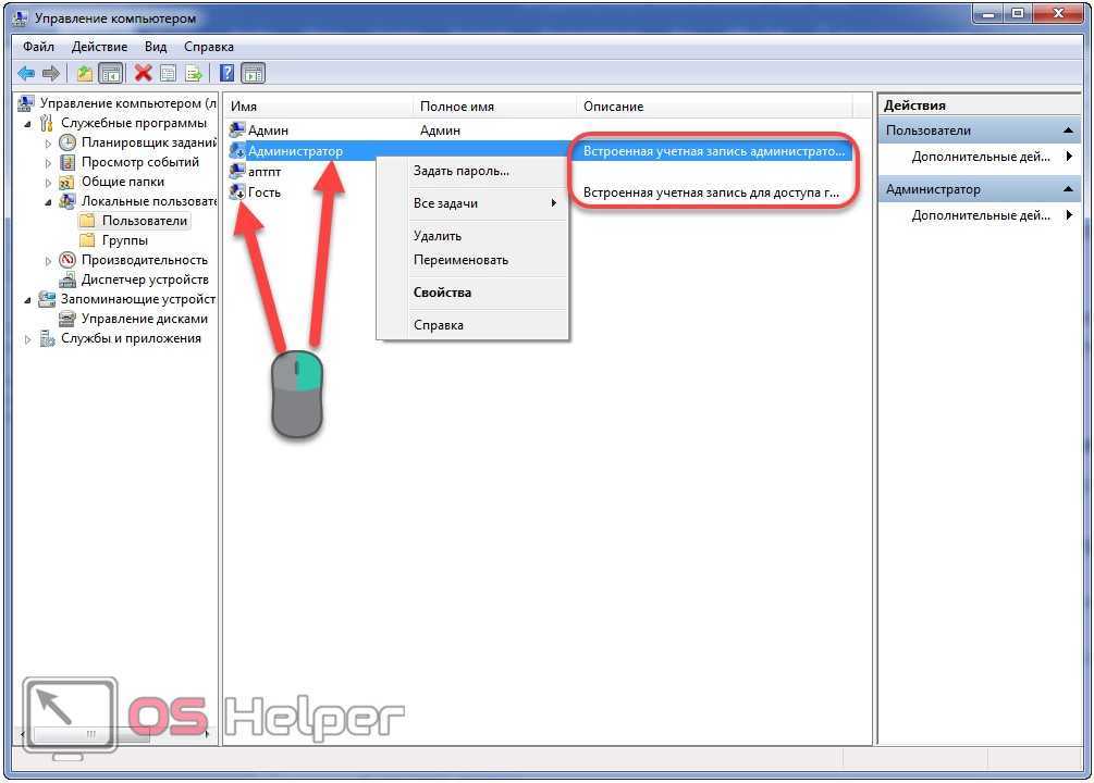 Здесь можно включить/отключить встроенные учётные записи «Гость» и «Администратор» через их свойства.