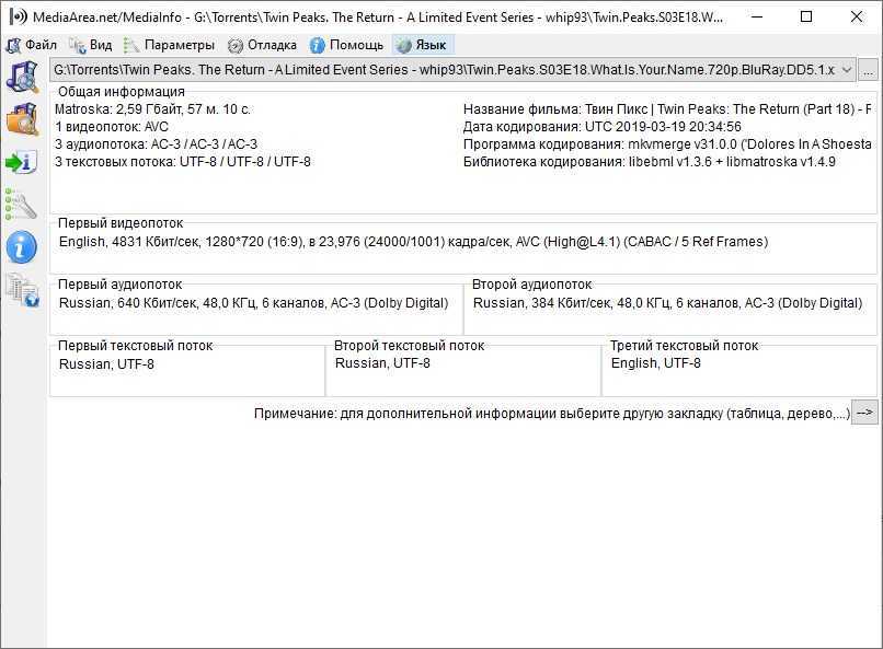 - Контейнер файла Matroska, размер 2,59 ГБ, длина 57 минут 10 секунд;