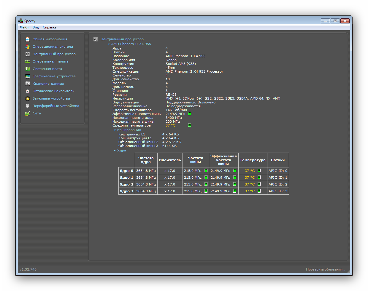 - Далее идут вкладки параметров конкретных узлов и устройств. На примере пункта «Центральный процессор» видно, что отчет достаточно информативен и уступает платной AIDA 64 лишь в отсутствии специальных данных.