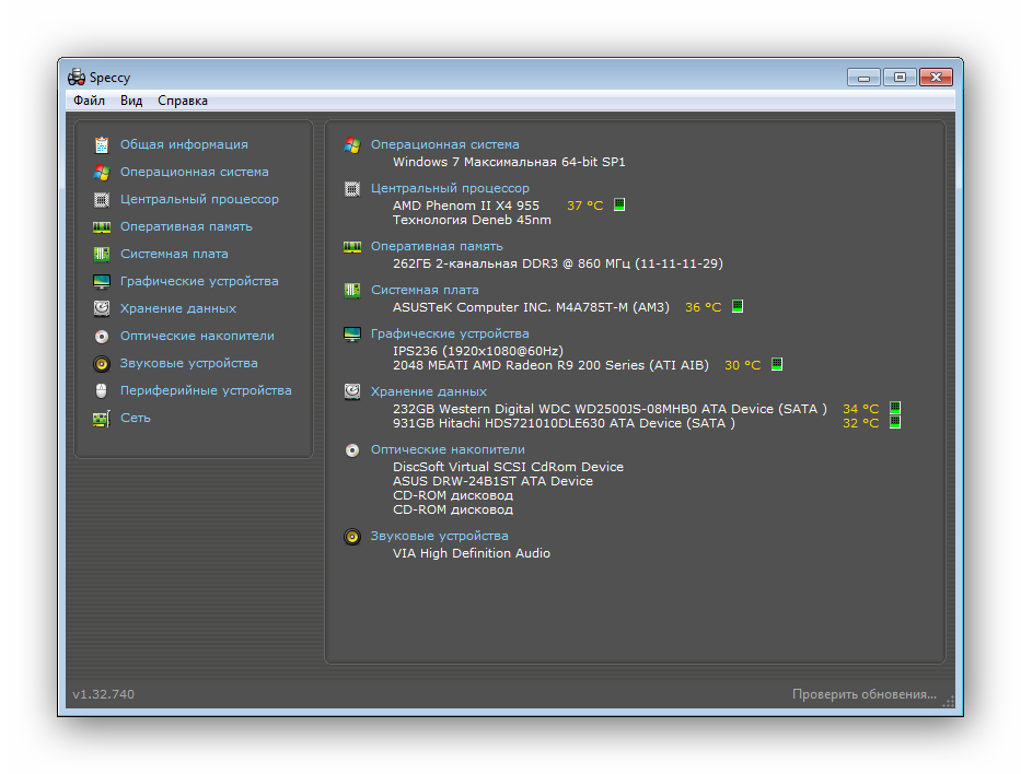 - Запустив программу, мы сразу увидим основную информацию о компьютере с указанием температуры ЦП, ГП, чипсета и жестких дисков.