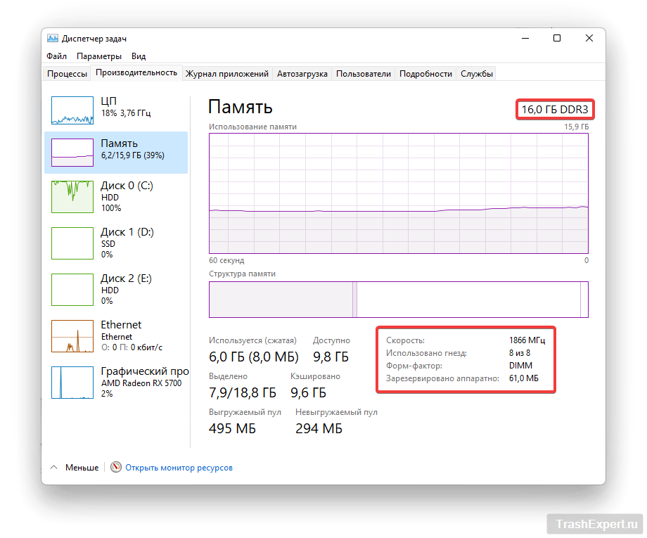 Тип оперативной памяти можно узнать в диспетчере задач на вкладке «Производительность». Справа от заголовка «Память» отображается её объём, скорость и сколько слотов она занимает.