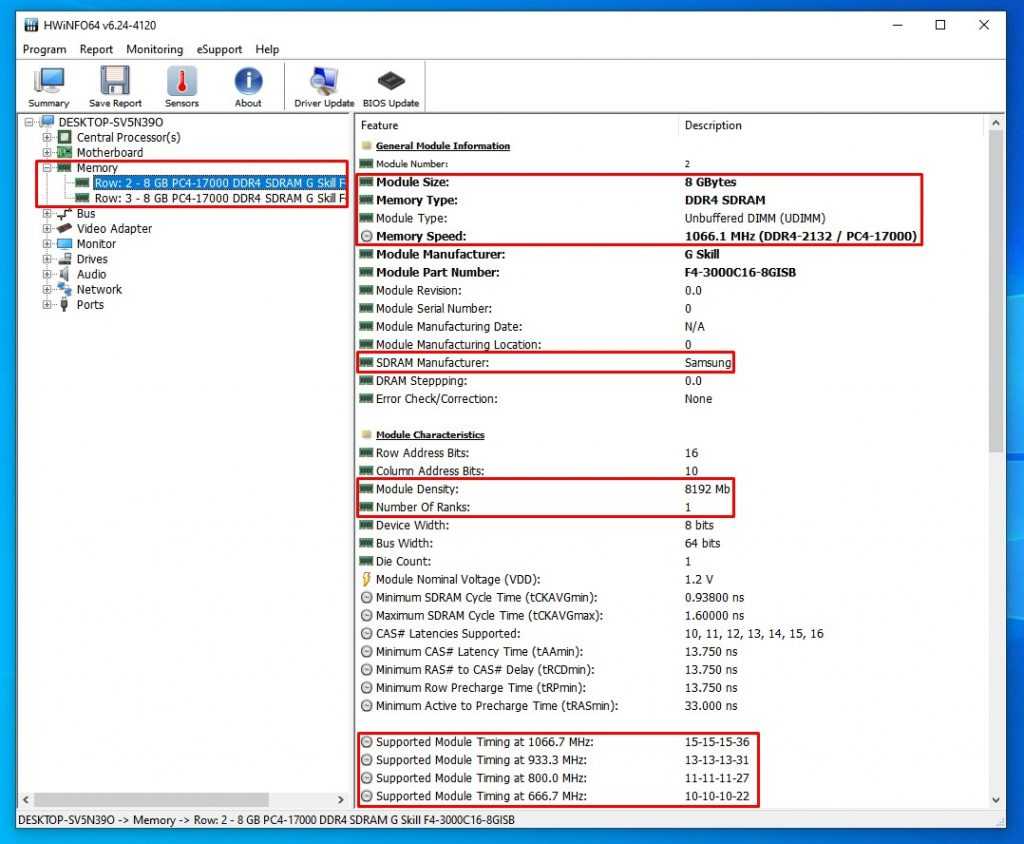 Всю эту информацию можно узнать с помощью утилиты HWiNFO64 в ветке Memory для каждого из модулей: