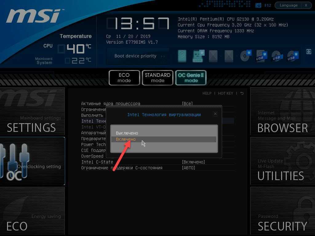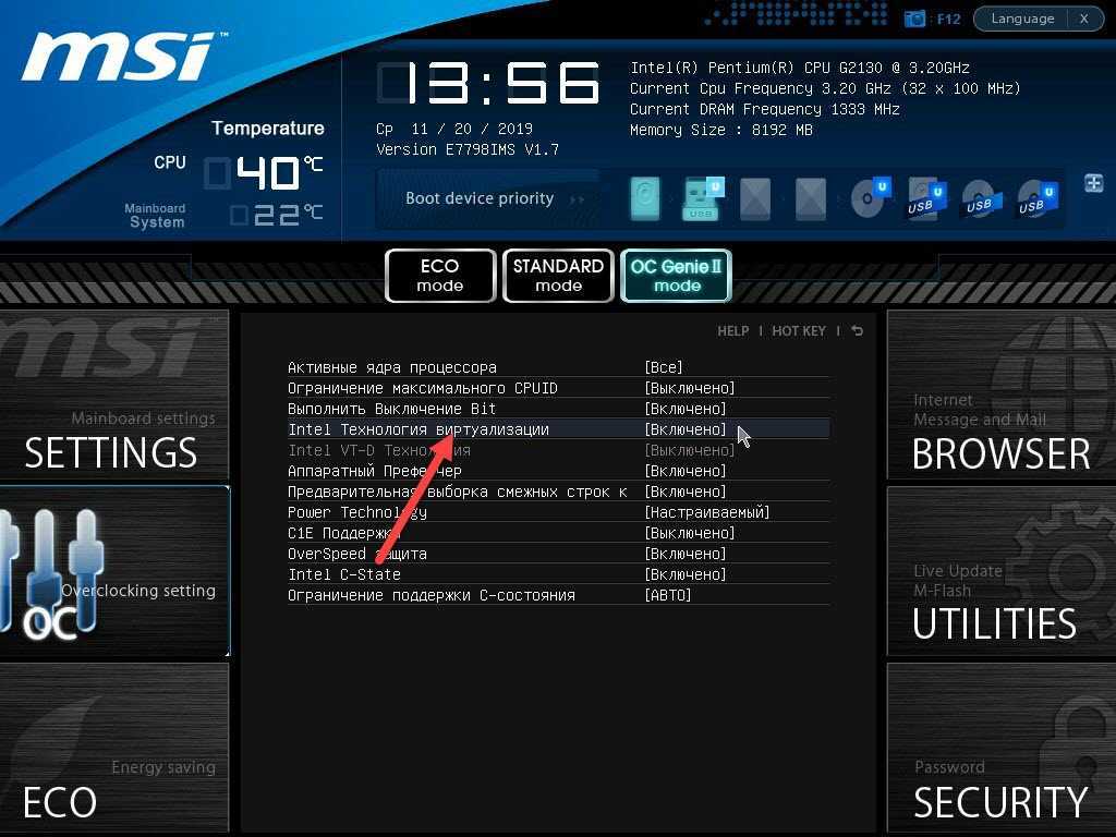 Рассмотрим как включить виртуализацию intel на примере BIOS от MSI. Здесь нужно проделать следующее: