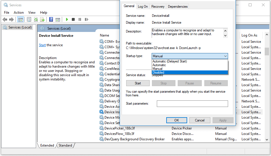 Шаг 2. Затем вы можете найти и дважды щелкнуть службу, чтобы открыть ее Свойства диалоговое окно и выберите Отключено вариант в раскрывающемся списке рядом с Тип запуска .