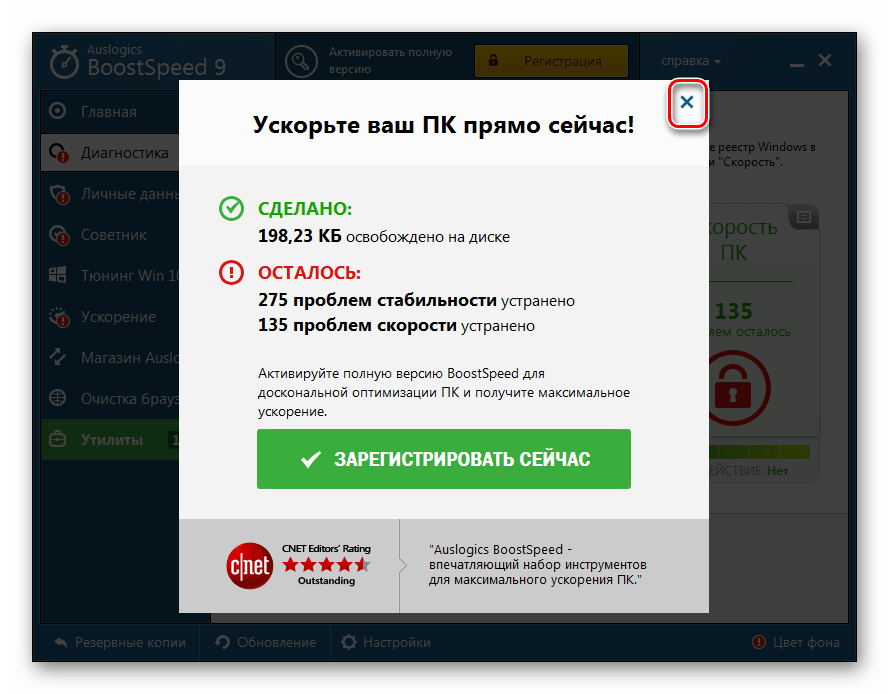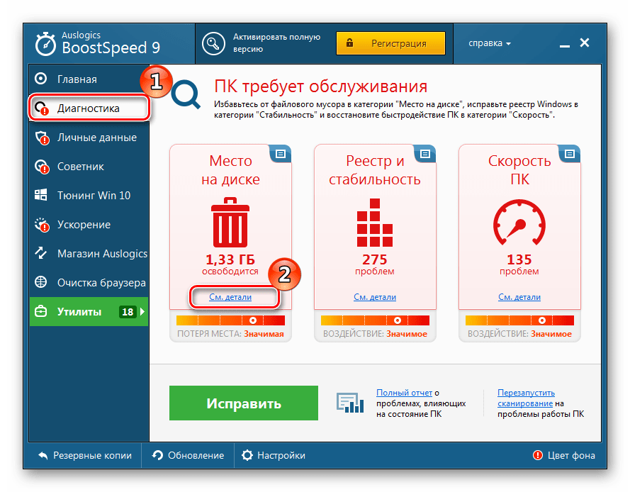 AusLogics BoostSpeed — целая сборка утилит для оптимизации работы ПК. Подходит для продвинутых пользователей. Есть существенный недостаток: обилие рекламы и навязчивое предложение купить полную версию.