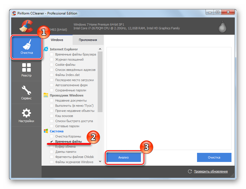 - После запуска в меню «Очистка» отметьте галочками те объекты, которые вы хотите удалить. Временные файлы находятся в подменю «Система». Нажмите кнопку «Анализ».