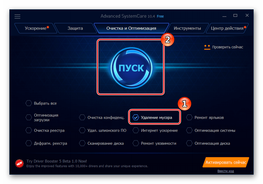 - В главном окне отметьте пункт «Удаление мусора» и нажмите большую кнопку «Пуск».