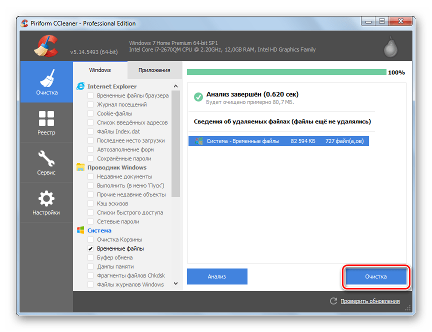 Очистить содержимое папки Temp также можно с помощью стороннего софта, к примеру, программы CCleaner – наиболее популярной утилиты для очистки компьютера и оптимизации системы. В таком случае достаточно просто запустить приложение, выполнить анализ содержимого и затем в разделе «очистка» установить галочки напротив соответствующих пунктов.