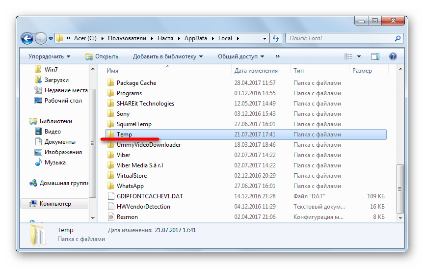В Windows 7 искомая папка находится по адресу: C:\Users\Имя учетной записи\AppData\Local\Temp