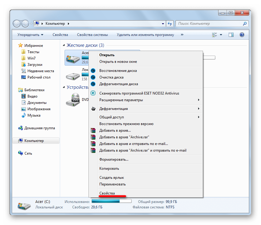 - В «Проводнике» нажмите правой кнопкой мышки на ваш жесткий диск С (или другой, на котором у вас установлена система) и в контекстном меню нажмите на «Свойства».