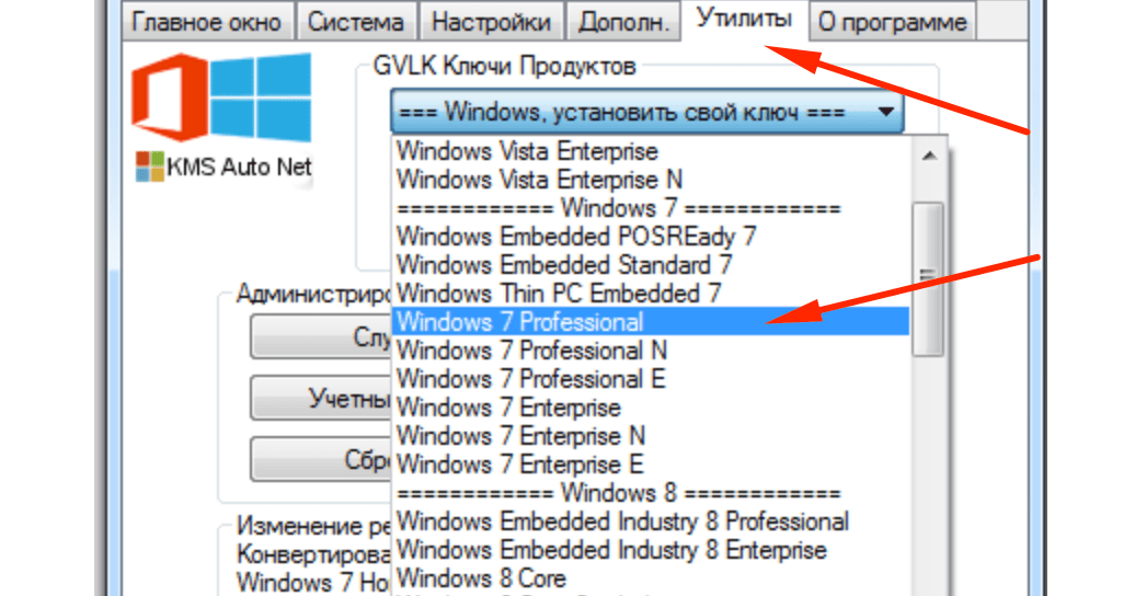 GVLK-ключ продукта — это тот самый лицензионный ключ, который проверяется на подлинность. Если к программы не получилось самостоятельно определить версию Windows и подобрать к ней ключ, сделать это можно самостоятельно. Нужно зайти в раздел Утилиты и выбрать активируемый продукт из выпадающего списка.