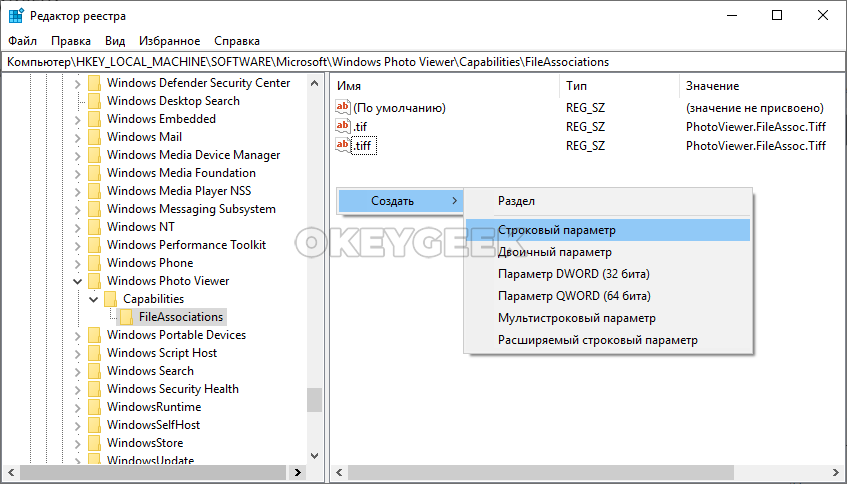 Обратите внимание: Если такого раздела нет, его необходимо создать. В папке FileAssociations необходимо создать простые строковые параметры, название которых будет соответствовать расширению файла, который планируется открывать с помощью приложения “Просмотр фотографий Windows”