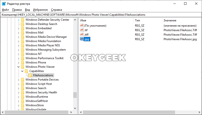 Компьютер\HKEY_LOCAL_MACHINE\SOFTWARE\Microsoft\Windows Photo Viewer\Capabilities\FileAssociations