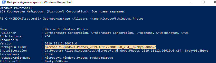 Дальше копируем полное имя приложения фотографии в пункте PackageFullName и вставляем его в команду вместо PackageFullName. Не можно сделать скопировать универсальную команду и просто выполнить, так как в разных версиях операционной системы PackageFullName отличается.