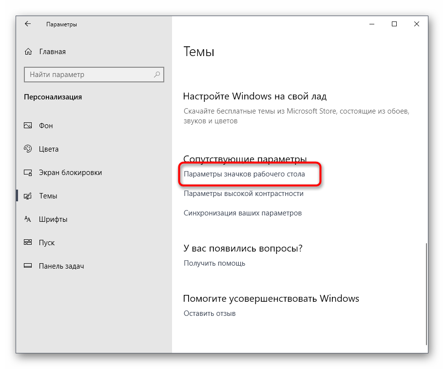 В разделе «Сопутствующие параметры» кликните по надписи «Параметры значков рабочего стола».