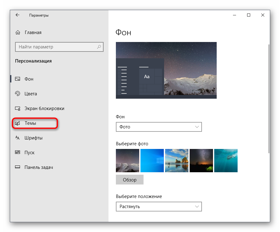 Воспользуйтесь меню слева, чтобы переместиться в категорию «Темы».