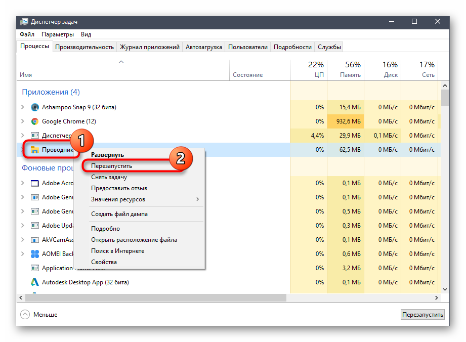 Отыщите «Проводник», нажмите по данной строке правой кнопкой мыши и перезапустите этот процесс, чтобы произошло обновление рабочего стола.
