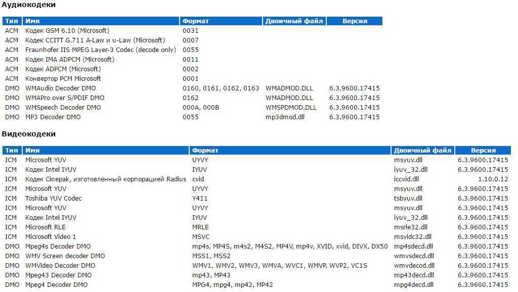 После нажатия в браузере будет открыта вкладка (наличие интернета не требуется), которую нужно пролистать до необходимых данных и проверить, каких именно кодеков не хватает.