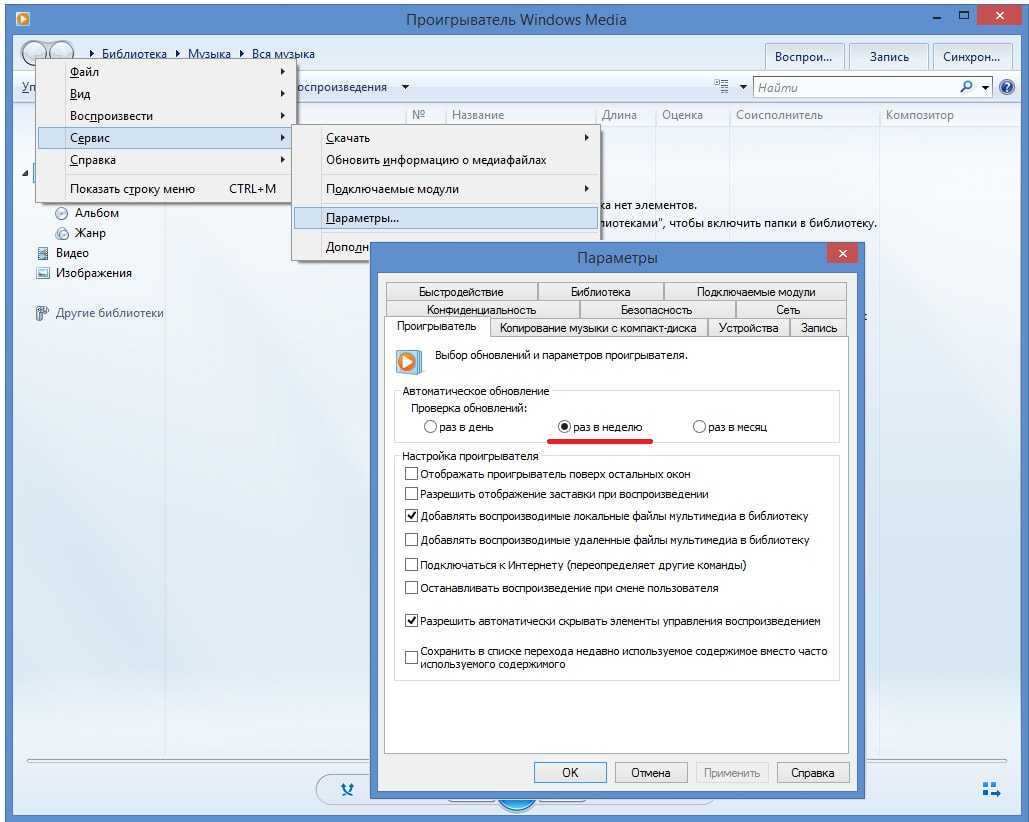 Автоматический режим: Откройте проигрыватель Windows Media, нажмите клавишу «Alt», перейдите в меню «Справка» и нажмите «Проверить обновления».