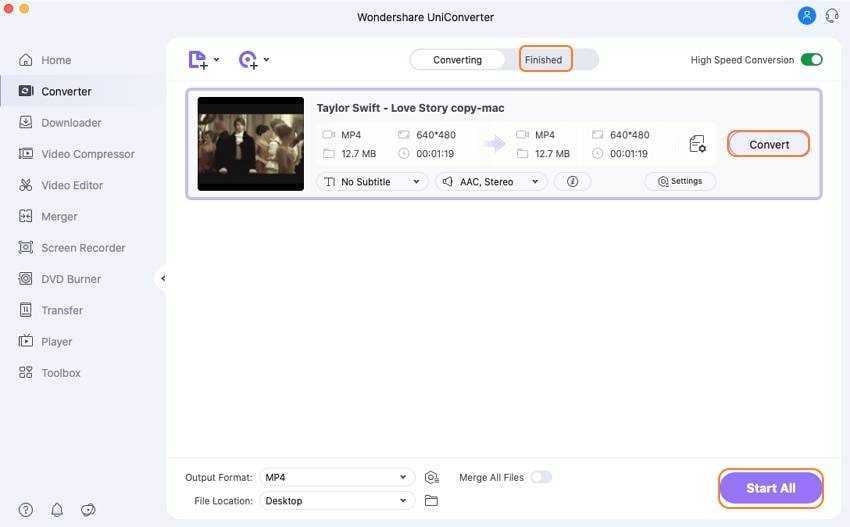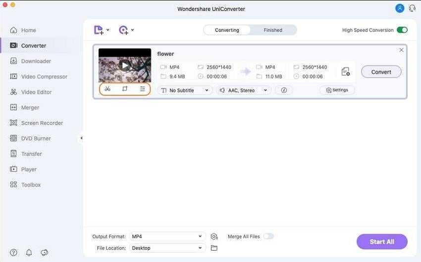 Хотя импорт видео GoPro на компьютер Mac может быть немного сложным, как только они находятся на диске, Wondershare UniConverter достаточно эффективен, чтобы справиться со всеми оставшимися задачами для вас, будь то конвертация в другой формат, основные обрезки и кадрирования видео, или даже добавление эффектов перехода, водяные знаки, или субтитры к видеоматериалам. Поскольку Wondershare UniConverter также может выполнять массовую конвертацию, вы можете импортировать в него несколько видеороликов GoPro, использовать описанные выше инструменты для редактирования клипов по мере необходимости, выбрать желаемый выходной формат и качество видео и нажать Convert All в правом нижнем углу главного окна.
