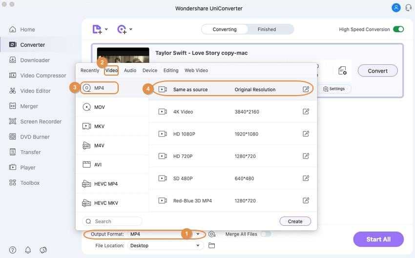 Нажмите и откройте Output Format: меню, как только вы вернетесь в главное окно, выберите желаемый формат видео в левой панели (MP4 здесь), выберите подходящее качество видео в правой панели меню, выберите/определите выходную папку в поле Output внизу, и нажмите Start All, чтобы начать процесс конвертации.