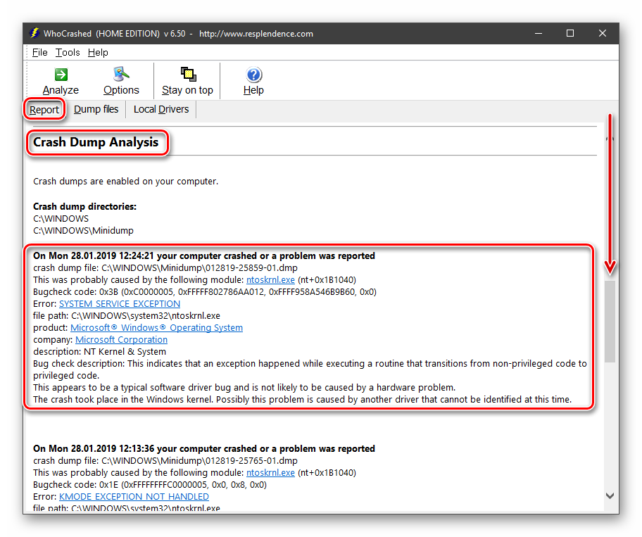 На вкладке «Report» прокручиваем текст вниз и ищем раздел «Crash Dump Analysis». Здесь представлены описания ошибок из всех существующих в системе дампов