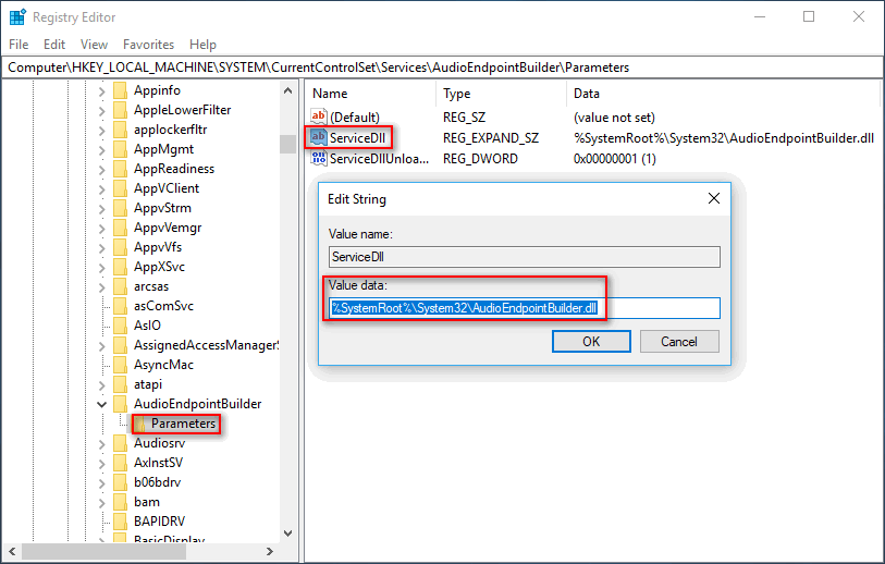 - Если данные значения не % SystemRoot% System32 AudioEndPointBuilder.dll ., пожалуйста, измените это.