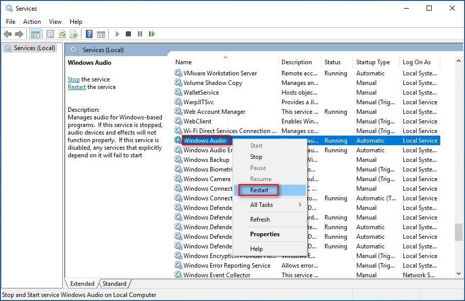 5) Щелкните правой кнопкой мыши Windows Audio , затем Перезагрузите .