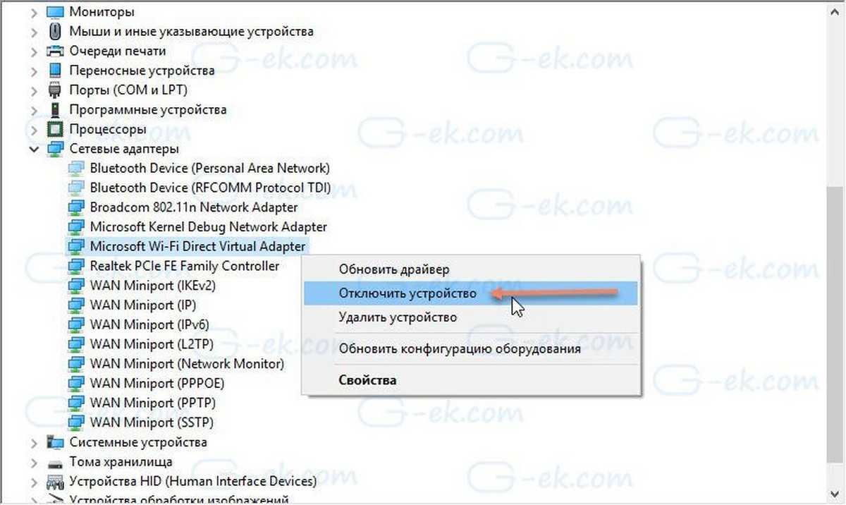 - Кликните правой кнопкой мыши на виртуальном адаптере Microsoft Wi-Fi и выберите в контекстном меню пункт «Отключить устройство».