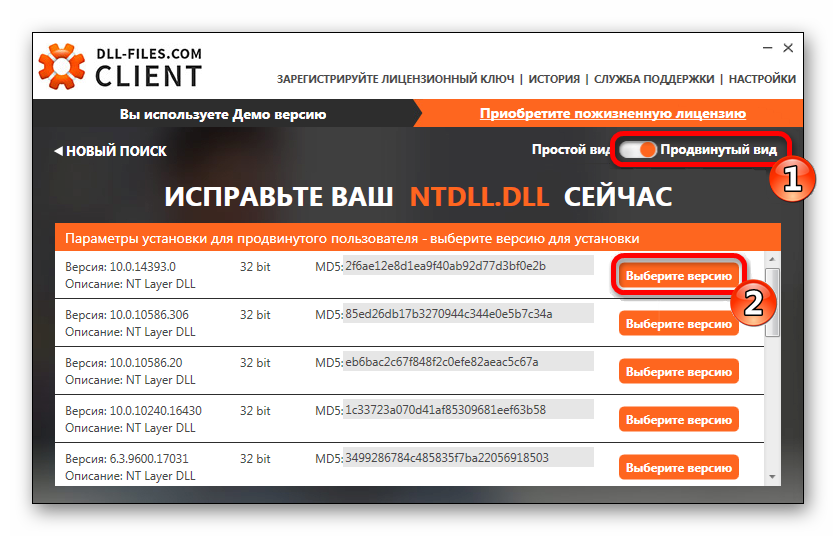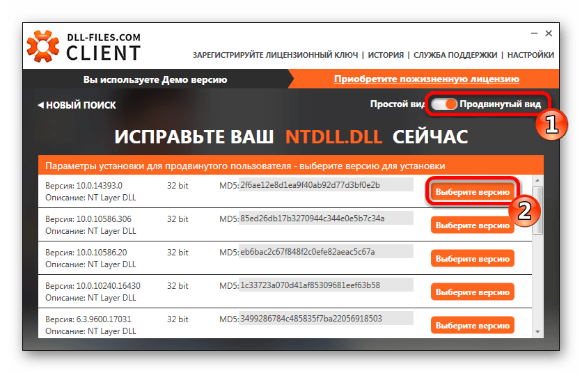 - Выбрать нужный вариант ntdll.dll и нажать «Выберите версию».
